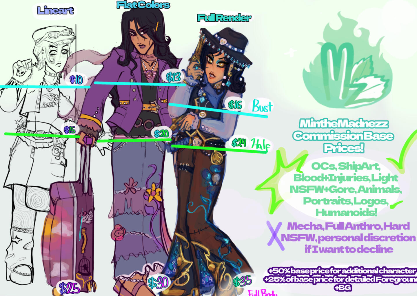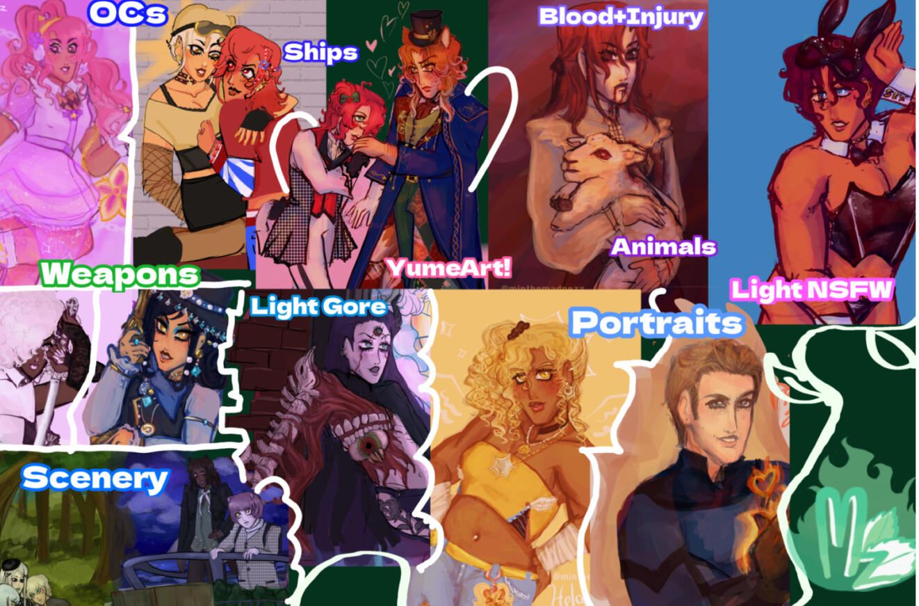 ✓OCs, Ship Art (including Yume), Blood+Injuries, Light NSFW, Animals, Portraits, Logos, Humanoids ✓